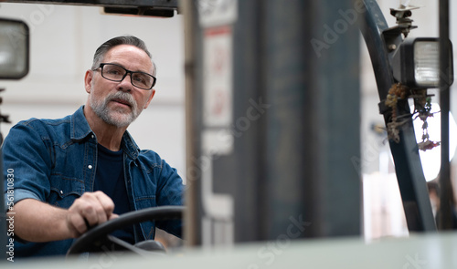 Male factory manager working in warehouse driving forklift truck. Portrait of forklift driver employee transporting merchandise in storehouse delivering to shelf. Industrial worker in industry vehicle