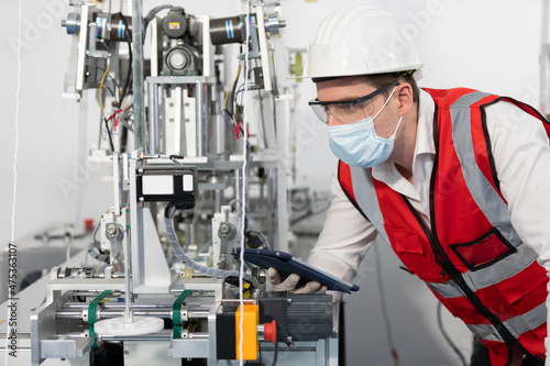 male factory worker holding tablet computer and operating machine in factory