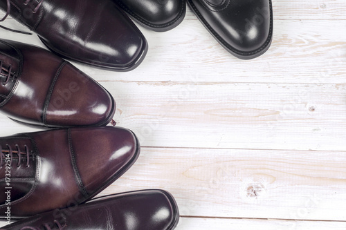 Male fashion with shoes on wooden background.