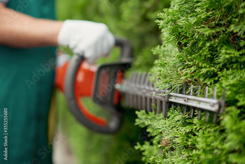 Male gargener trimming hedge using special tool.