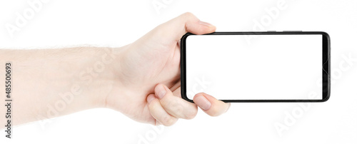 Male hand holding the black new smartphone with blank screen isolated white background. Man hands using phone clipping path. blank for designer