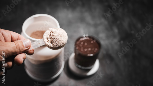 Male hand holds measuring spoon with whey protein powder above plastic jar on dark background