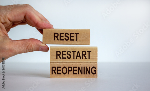 Male hand placing a blocks with word 'reset' on top of a blocks tower with words 'restart, reopening. Beautiful white background. Business concept. Copy space.