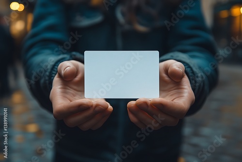 Male hands holding a blank card outdoor, blurred background, modern, promotion mockup