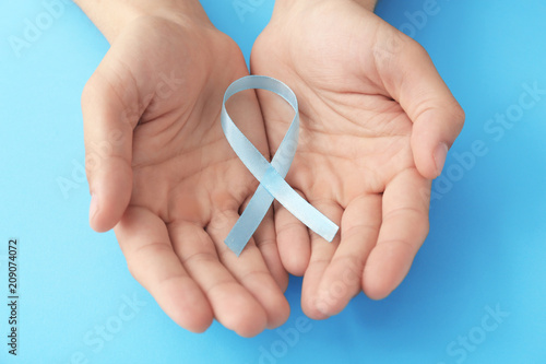 Male hands holding blue ribbon on color background. Prostate cancer concept