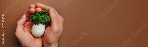 Male hands holding eggshell with cucumber sprouts on brown background