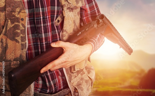 Male hunter hold a gun in forest background