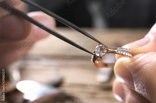 Male jeweler examining diamond ring in workshop, closeup view