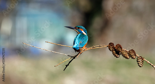 Male kingfisher perched on a branch with pine cones
