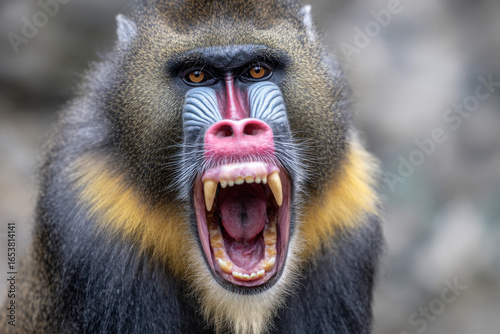 male mandrill (mandrillus sphinx) with wide opened mouth