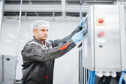 Male operator engineer controls production line from control panel, food factory