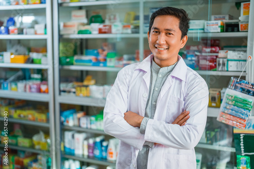 male pharmacist in uniform smiling with crossed hands on pharmacy display case background