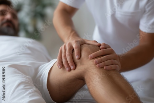 Male Physical Therapist Examining a Senior Man's Knee in a Clinic