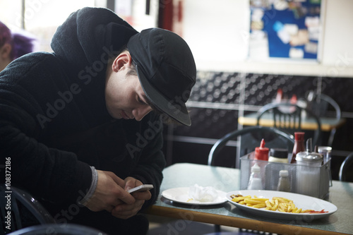 Male Student In Café Checking Message On Mobile Phone