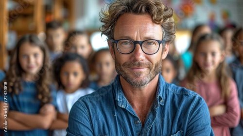 Male teacher posing in with his students in classroom