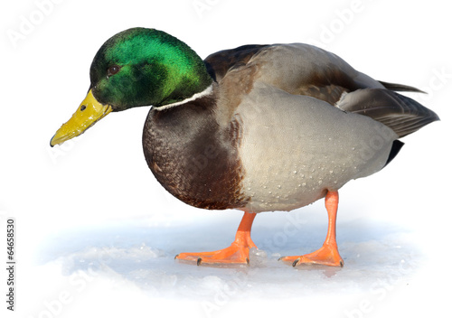 Mallard duck walking on ice. Isolated on white.
