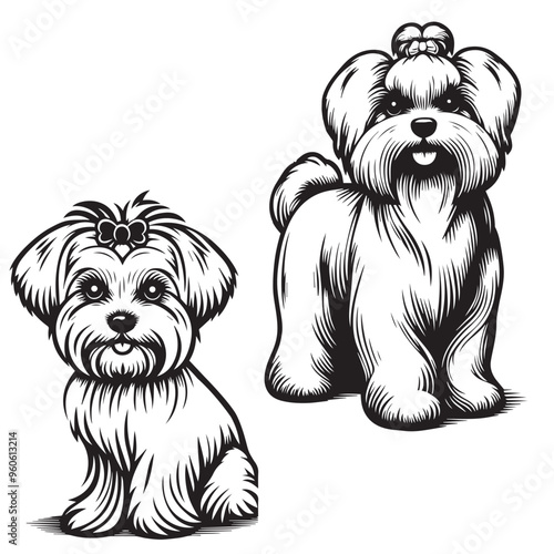 Maltese Dog Silhouettes , Cute Bichon Fris dog portrait vector, Maltese dog breed head vector illustration. Pet portrait in style of hand drawn black doodle, Maltese Beloved Companion Breed