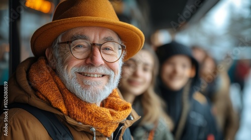 Man and a woman are standing next to each other. The man is wearing a brown jacket and a scarf, while the woman is wearing a black jacket. old man offending a group of young people at a bus stop