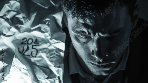 Man and crumpled paper, monochrome, shadowed, intense look.