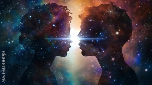 man and woman silhouette on front starry sky cosmic nebula universe esoteric background concept