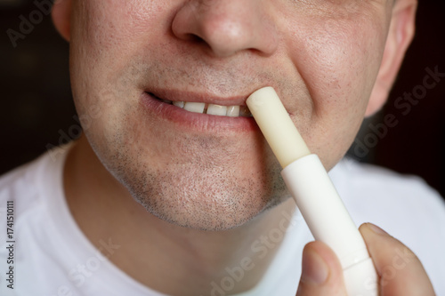 Man Applying Lip Balm or Lipstick in Front of Mirror