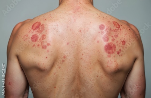 Man back skin affected by rash, red spots. Condition might dermatitis, eczema, skin infection, allergy reaction. Red inflamed spots. Close up view of human body, health issues, dermatology, medical