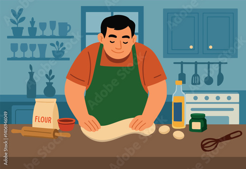 Man baking at home. Young man rolling out dough with a rolling pin. Chef making bakery and pastry treats. Sweets and desserts. Daily household tasks in flat vector style.