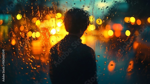 Man Behind the Rainy Dripping Glass Window Generative AI