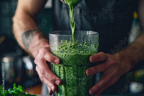 Man blending a green smoothie for breakfast