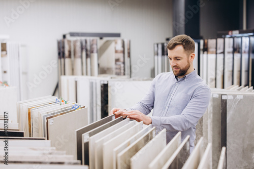 Man browsing ceramic tile samples, planning a new interior design project for living space improvement