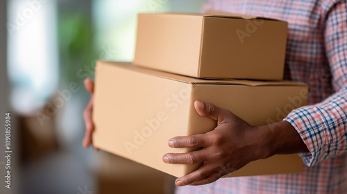 Man carrying stacked cardboard boxes indoors, moving or delivery concept