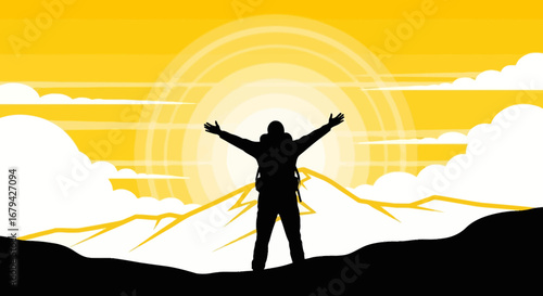 Man Celebrating Victory Reaching Mountain Peak at Sunset in a Vector Illustration