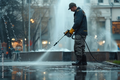 Man Cleaning Fountain With Water Hose