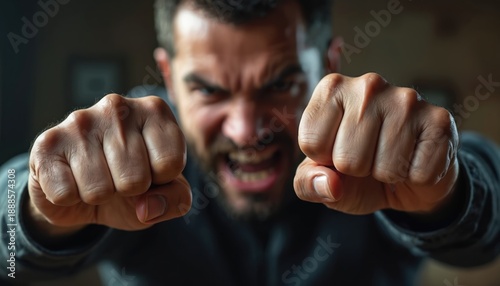 Man clenches fists, showing intense anger, frustration. Furrowed brows, bared teeth convey strong negative emotion. Aggressive posture suggests impending conflict or struggle. He is ready to fight.