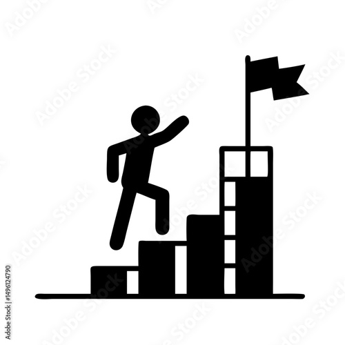 Man climbing stairs to success achievement goal reaching flag leadership vector illustration