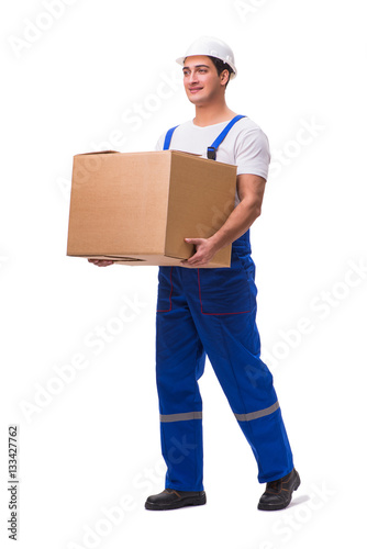 Man delivering box isolated on white