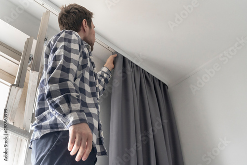 man doing house works, attach the railing and hang curtains at home