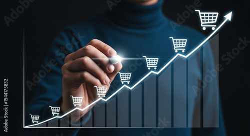 Man drawing an upward trending graph with shopping cart icons on a dark background in a studio shot