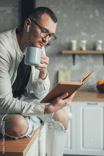 Man drinking morning tea in the kitchen reading paper book. Cozy home concept. Kitchen interior. Relax concept.