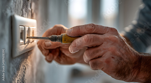 Man electrician installing a light switch on the wall. Electrical wiring work during renovation or construction. Home improvement concept.