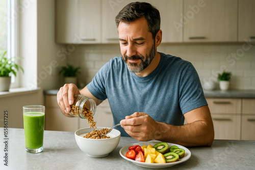 Man enjoying healthy breakfast with fruits and granola in kitchen