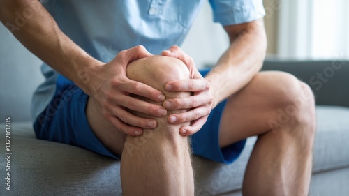 Man experiencing knee pain sitting on a couch