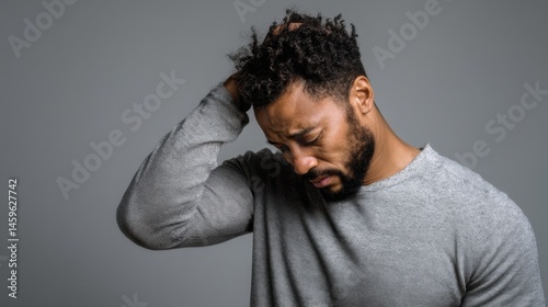 Man expressing frustration in a neutral-toned setting while touching his head and looking down