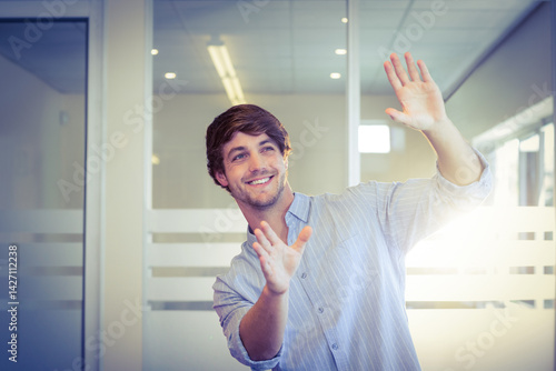 Man gesturing with both hands in modern office space, showing frosted glass partitions with stripes