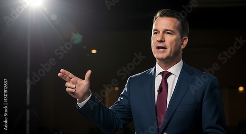 Man Giving Presentation on Stage Wearing Suit and Tie with Confidence