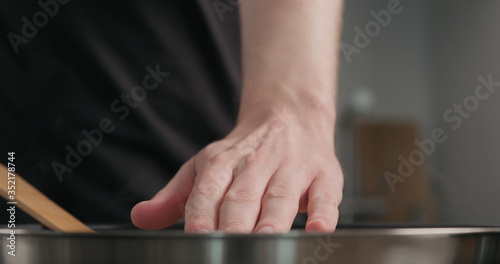man hand check heat from frying pan