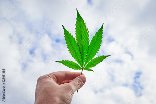 Man hand holding a Cannabis leaf towards the sky with white clouds, plant close-up, marijuana