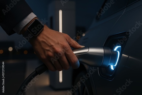 Man hand plugging electric vehicle charging cable into car with glowing port