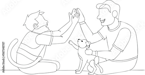 Man high-fiving with his little boy in continuous line art drawing style