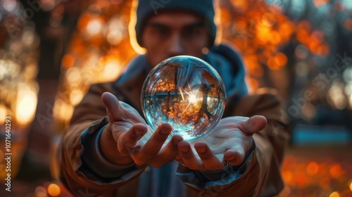 Man Holding A Crystal Ball With Autumn Leaves Reflected